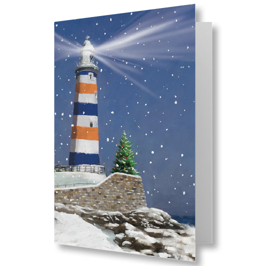 Our MND Lighthouse card features an illustrated image of an lighthouse at night. The lighthouse is adorned with orange and blue stripes to match the MND Associations branded colours. The lighthouse shines brightly on a dark and snowy night with a Christmas tree at the bottom.