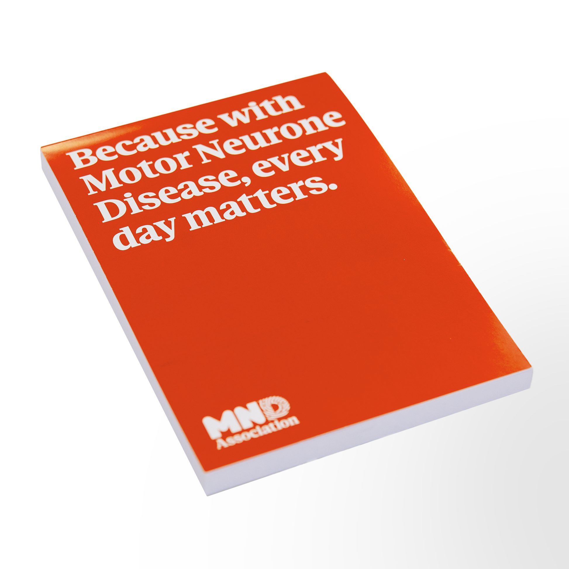 The pad has 100 pages featuring the MND Association logo in the bottom right hand corner in Terracotta. The front cover features a terracotta background with the words 'Because with Motor Neurone Disease, every day matters' and the association logo in white.
